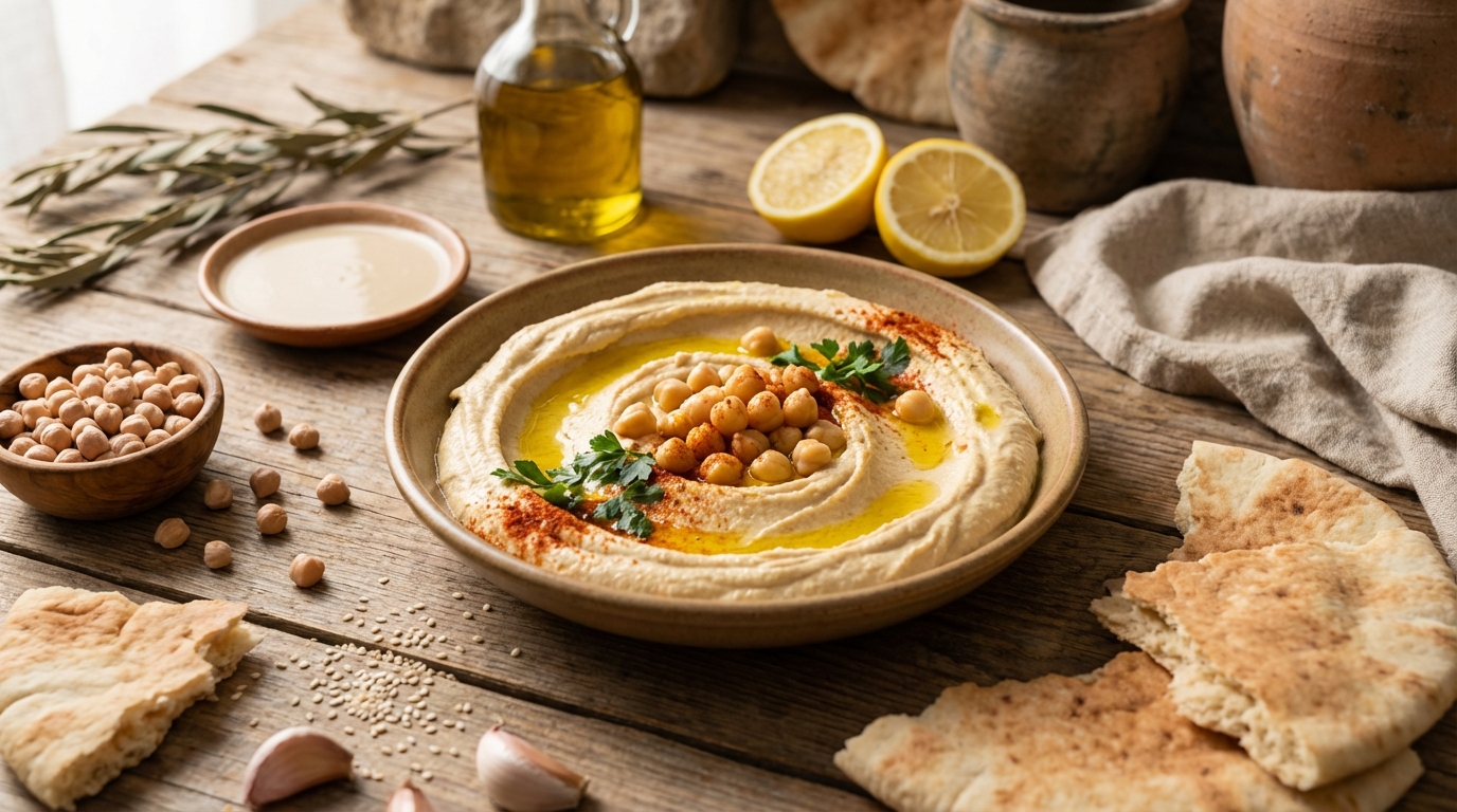 Hummus ist ein regionales Gericht des östlichen Mittelmeerraums, entstanden aus gemeinsamen landwirtschaftlichen Bedingungen und kulinarischen Praktiken, lange bevor heutige Nationalstaaten existierten.